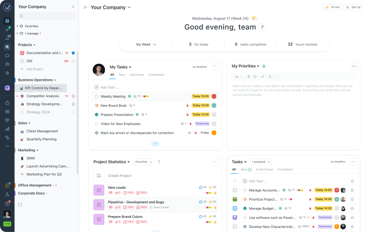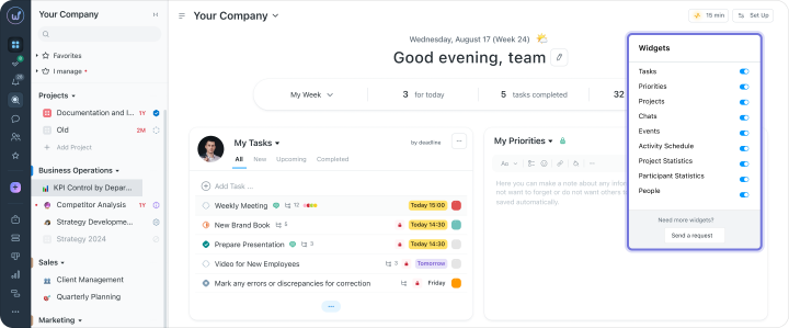 - Статистика проектов и участников — ключевые метрики проектов и эффективности участников: прогресс, завершенные задачи, затраченное время.