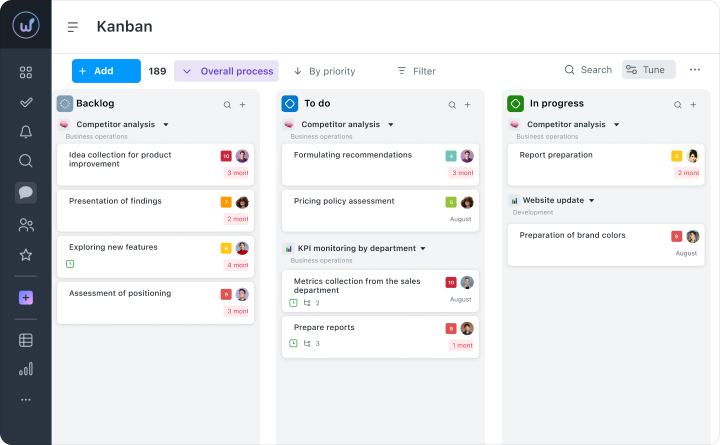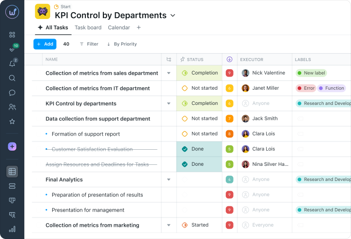 - Задачи — все задачи в одном списке: вы можете фильтровать, сортировать и быстро находить нужные по срокам, проектам или исполнителям.