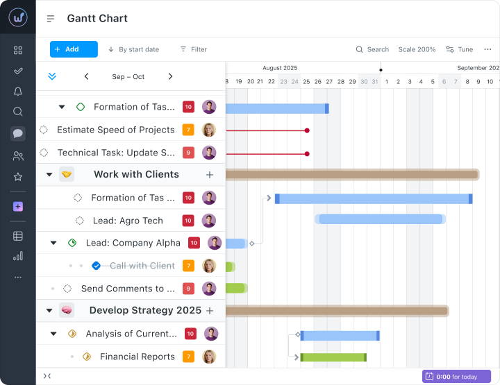 Мы обновили дизайн диаграммы Ганта в Worksection 2.0, чтобы сделать его более удобным для ежедневного планирования. Задачи и сроки можно перетаскивать прямо по временной шкале, переключаться между разными масштабами (дни, недели, месяцы) и видеть, как задачи связаны между собой. Изменения обновляются мгновенно — даже для больших проектов.