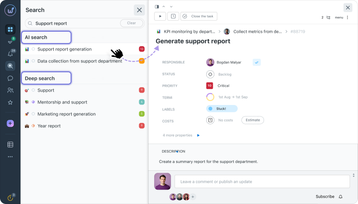 Когда вы вводите запрос из трех или более слов, система автоматически запускает семантический поиск по описаниям задач и комментариям. В отличие от обычного поиска по совпадению слов, поиск ИИ находит результаты на основе контекста.