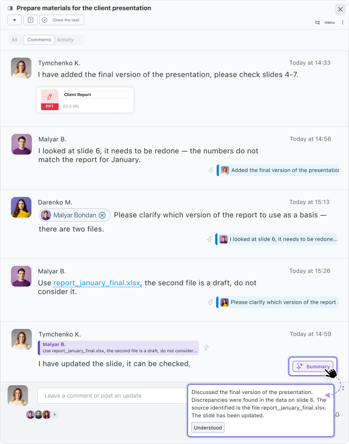 Когда в задаче много непрочитанных комментариев, автоматически появляется кнопка “Резюме”. Один клик — и вы получаете краткое резюме обсуждения от ИИ вместо того, чтобы читать все сообщения. Это удобно, когда вы возвращаетесь к задаче после перерыва или присоединяетесь к проекту на более позднем этапе.