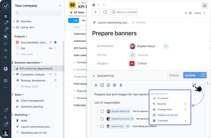 Мы добавили возможность редактирования текста с помощью ИИ в поле описания задачи. Вы можете исправлять ошибки, переписывать текст, изменять тон, создавать список дел или переводить на другой язык.