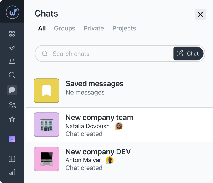- Встроенный мессенджер — приватные, групповые и проектные чаты прямо там, где происходит работа.