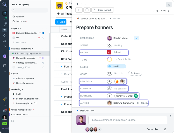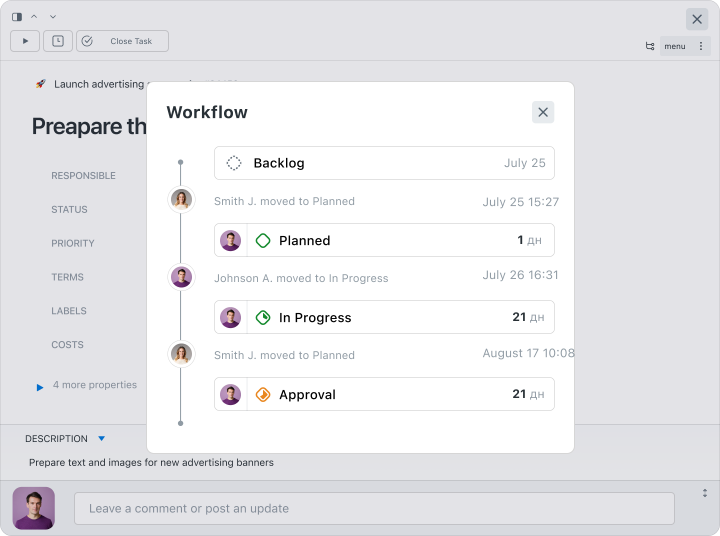 Больше не нужно переключаться в режим редактирования: сроки, ответственные лица, приоритеты или статусы меняются прямо в карточке задачи. Все изменения сохраняются мгновенно и сразу видны всей команде.