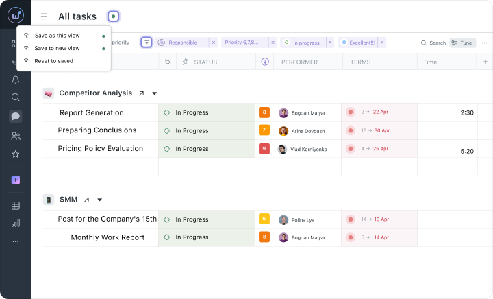 В Worksection 2.0 можно сохранять настройки таблицы задач и при необходимости делиться ими с командой.