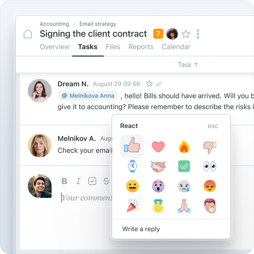 Software pro řízení projektů zlepšuje komunikaci a usnadňuje lepší týmovou práci. V rámci těchto nástrojů můžete přidávat komentáře k úkolům, stanovovat časové rámce a priority a sledovat čas při generování zpráv. Worksection poskytuje uživatelské role pro nastavení úrovní přístupu, což zajišťuje, že členové týmu mohou vytvářet nebo upravovat úkoly podle potřeby. Využívání nástroje pro řízení projektů zajišťuje, že všichni členové týmu jsou na stejné vlně, což podporuje bezproblémovou spolupráci. Navíc máme samolepky pro rychlé reakce!