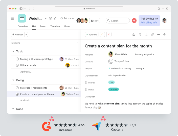 Asana verbindet kreative Einfachheit mit managementtechnischer Strenge. Neben Boards erhalten Sie Listen, einen Zeitplan, eine Arbeitslastansicht und einen Formular-Builder zur automatischen Erstellung von Aufgaben. Im Jahr 2025 fügte die Plattform einen KI-Assistenten hinzu, der Projekte in Meilensteine unterteilt und Risiken überwacht. Die kostenlose Version hat eine Obergrenze von 15 Sitzplätzen; Zeitverfolgung und Gantt-Diagramme werden mit Premium freigeschaltet (≈ 10,99 € monatlich). Die klare Benutzeroberfläche zieht Marketing‑, Design- und HR-Teams an, die Prozessvisualisierung ohne technische Fachbegriffe benötigen.