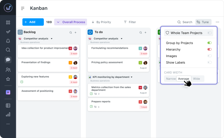 The search works not only by title but also by descriptions, tags, and assignees. You don’t need to enter an exact query — just part of a word, and the system immediately finds the needed card. The found task can be dragged into the desired column right away without any extra actions.Grouping Cards by Hierarchy