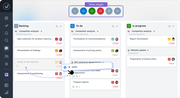 You can select several cards and change them at once: statuses, assignees, or deadlines. Tasks can also be copied, moved between columns, or deleted. With Drag&Drop and working with groups of tasks, updating a large volume of work at once is easy — for example, after a meeting or when priorities in the project change.