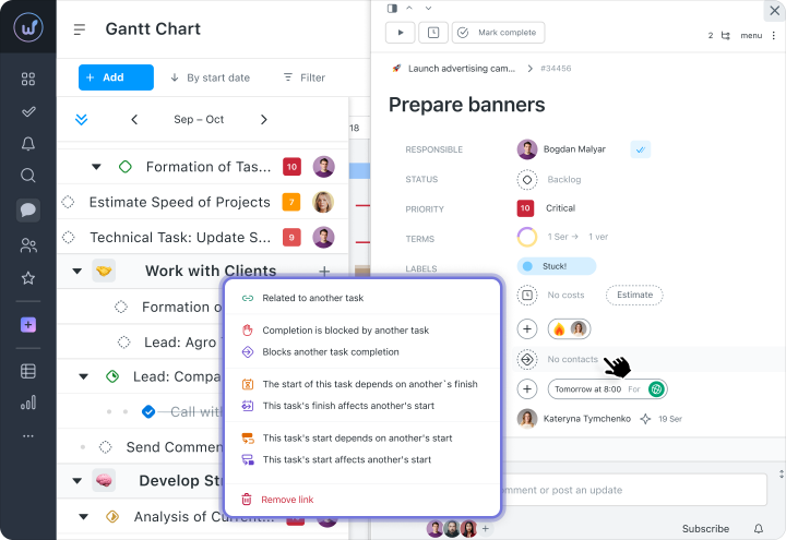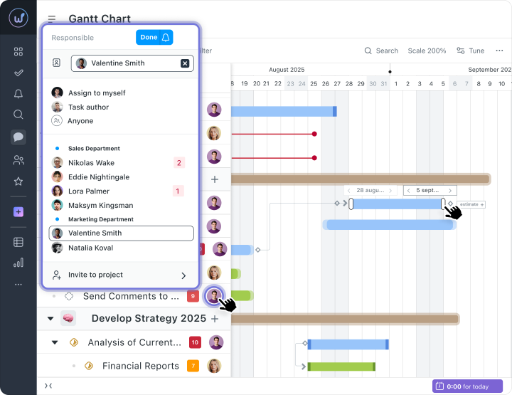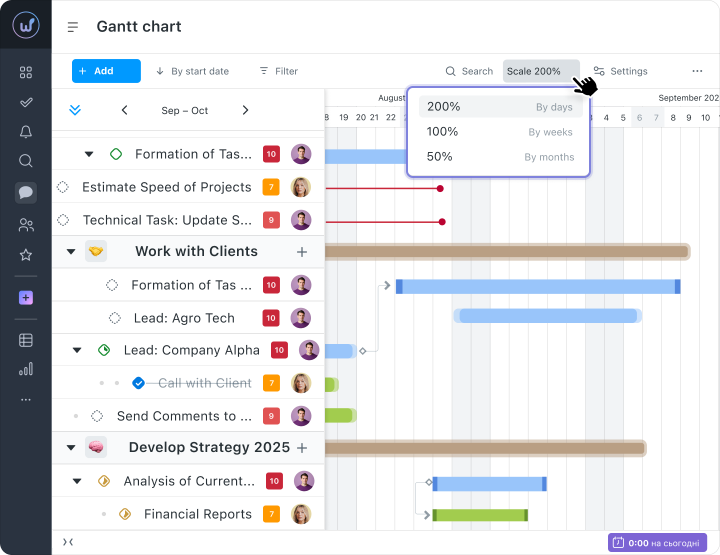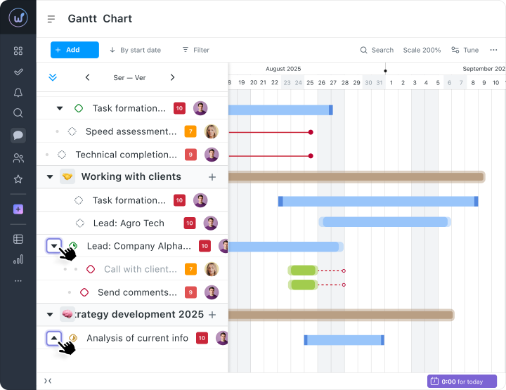 Deadlines, executors, and priorities can be changed directly on the timeline — without opening a separate task card. This speeds up updating the plan, especially after meetings or changes in project priorities.