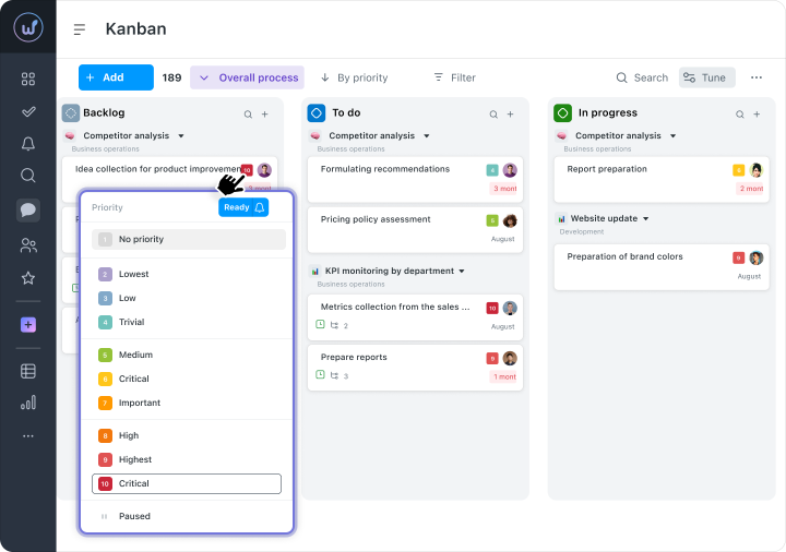 The Kanban board solves this simply: each task is at its own stage, and the entire process is visible at a glance. Where work is progressing and where it has stalled is clear without additional checks.