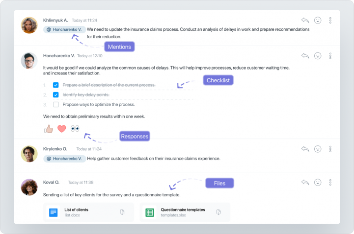 “Todas las tareas, discusiones y archivos se almacenan en un solo lugar. Siempre puedes encontrar rápidamente lo que necesitas, en lugar de buscar sin cesar archivos en varios chats” — Kostyantyn Palazov, CDO de Arsenal Insurance