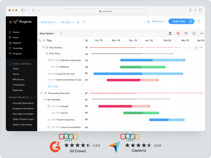 Zoho Projects es parte del ecosistema Zoho. La interfaz tabular se asemeja a Excel, y los Blueprints automatizan las etapas de tareas. Se sincroniza con Zoho CRM sin código, lo que es conveniente para los vendedores. Versión gratuita hasta 3 usuarios; el “Premium” cuesta $5. La principal diferencia con Planfix es la facilidad de configuración y las rápidas integraciones con otros productos de Zoho, pero la visualización es más débil que Worksection o ClickUp.