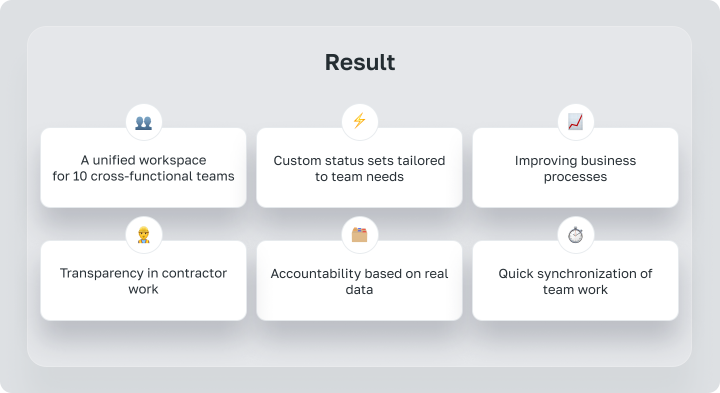 Problème : Chaque équipe utilisait son propre outil pour le travail. Les informations sur les projets étaient dispersées entre les e‑mails, les chats et les documents, ce qui créait un chaos supplémentaire. La difficulté à coordonner les processus entre les départements freinait la prise de décision.