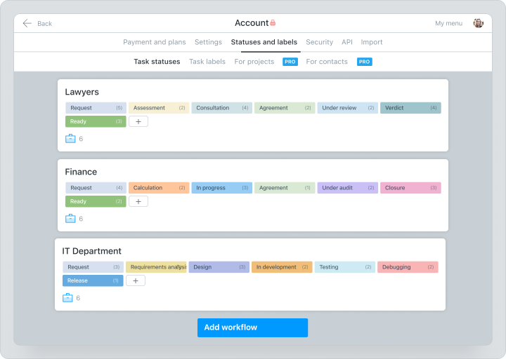 Chaque équipe gérait les projets à sa façon. L’alignement des tâches partagées prenait beaucoup de temps et nécessitait des clarifications constantes. Grâce à la migration de toutes les équipes vers Worksection, l’entreprise a optimisé les processus internes et la communication avec les entrepreneurs. Des statuts de tâches personnalisés et des étiquettes ont organisé la collaboration des équipes interfonctionnelles.