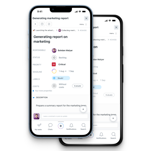 L’application pour iOS ou Android vous aidera à rester informé. Surveillez les projets, créez des tâches et échangez des messages avec votre équipe même en dehors du bureau.