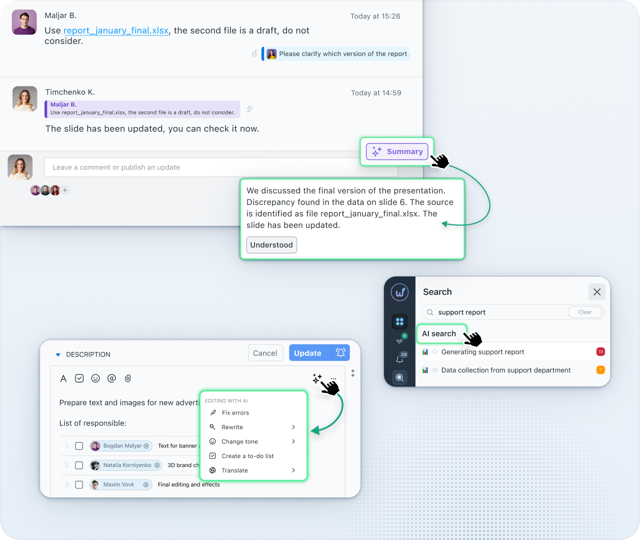 La recherche IA trouve ce dont vous avez besoin même avec une requête imprécise. Le résumé IA transforme de longues discussions en points clés. L'assistant IA aide à créer des descriptions de tâches plus rapidement et sans erreurs.