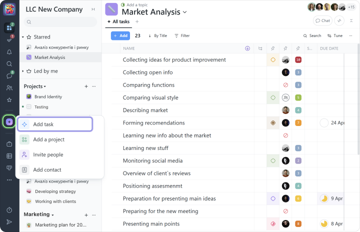 Примечание Когда вы находитесь внутри проекта, вы видите только задачи и участников этого проекта. Чтобы просмотреть задачи на уровне аккаунта, используйте кнопку «Список задач» и различные представления «Канбан» в левом боковом меню.