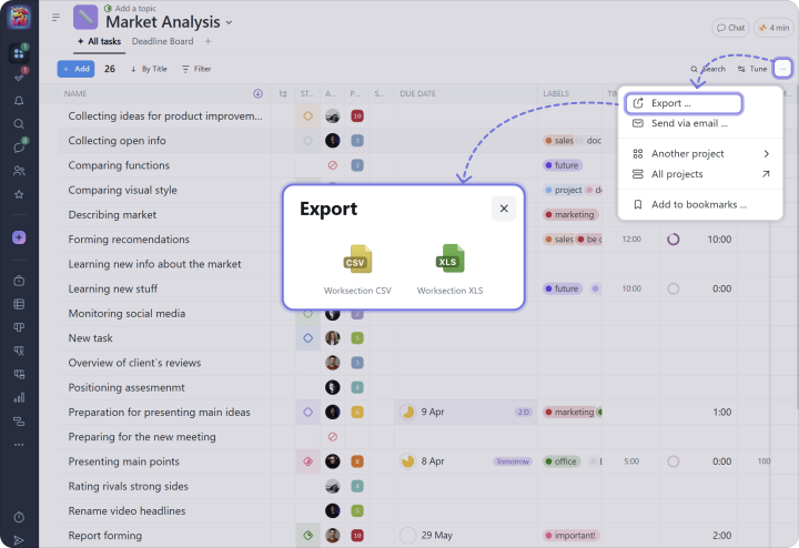 Как и любой список в Worksection, его можно экспортировать в Excel: