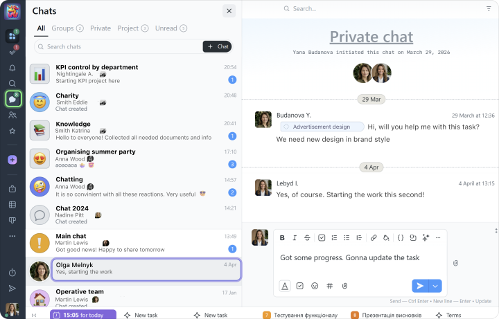 Worksection также включает чаты. Создавайте приватные, групповые или проектные чаты и обсуждайте любые темы, которые вам нужны: