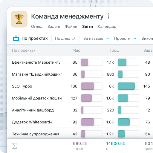 Жоспардағы қанша тапсырма нақты орындалғаны және қандай тапсырмалардың кешігуі болғаны туралы көрсететін жеті түрдегі есеп — тапсырмалар, уақыт, адамдар, күндер және жобалар бойынша. Жоба панелі команданың белсенділігін destacar етеді. Таңдалған кезең үшін есептер адамдар, жобалар немесе бір уақытта адамдар мен жобалар үшін сүзгілер негізінде жасалуы мүмкін.