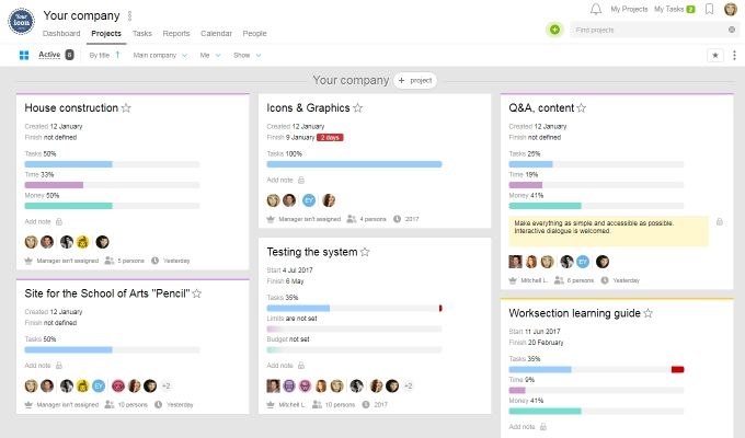 Esta é a página principal do projeto. Você pode ver todos os eventos do projeto em ordem cronológica. O Worksection o notificará sobre qualquer tarefa atrasada e criará uma lista de tarefas que estão prestes a vencer. Na coluna da direita, você pode ver as datas de início e término do projeto, a porcentagem de conclusão, bem como o custo e o tempo gasto. Além disso, você pode ver todas as pessoas e empresas envolvidas neste projeto.