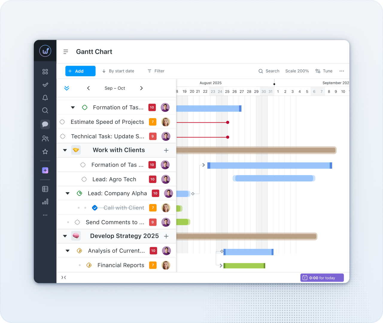 Chat-uri private, de grup și de proiect chiar în sistem. Menționați colegii și sarcinile din chat, folosiți fire pentru discuții și programați trimiterea mesajelor. Fără a mai comuta între servicii diferite.