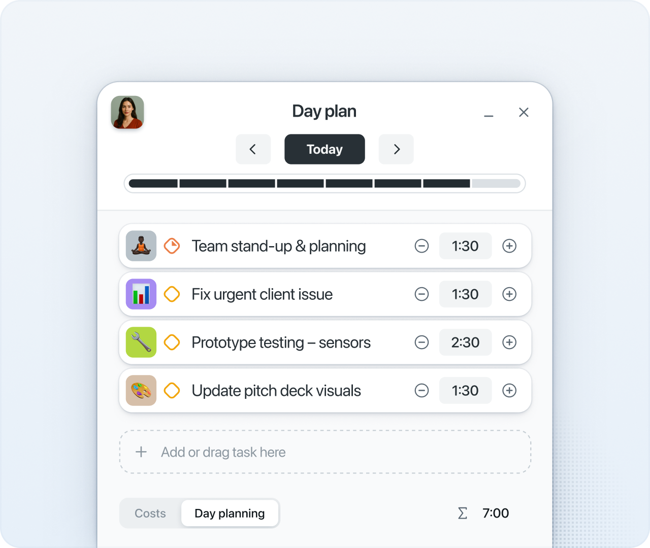 Planificați-vă ziua de lucru pe ore pentru a evita suprasolicitarea. Vizualizați sarcinile în format tabel cu setări de coloană, editare instantanee și vizualizări salvate, și împărtășiți-le cu echipa dumneavoastră.