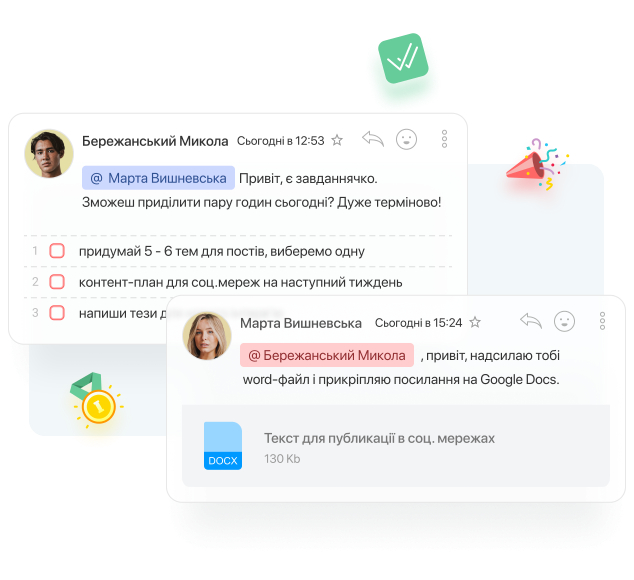 Комунікація До задач прикріплюється груповий чат в якому ведуться обговорення. Щоб вникнути в завдання, вам не потрібно піднімати всю переписку з пошти, а достатньо зайти в систему і побачити хронологію подій та коментарів. Ви можете @згадувати людей, реагувати з допомогою Emoji, прикріплювати фото і документи.Комунікація