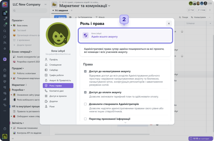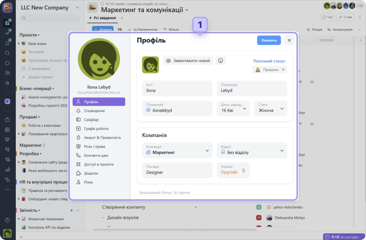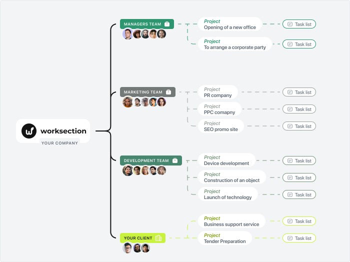 Акаунт у Worksection складається з відділів та команд співробітників, по яким розподіляються проєкти та задачі.