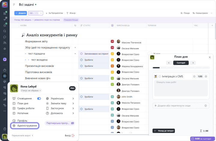 Зрозумілий інтерфейс з Діаграмою Ганта, Канбан, Дашбордами, вбудованим таймером, інтеграціями, внутрішніми чатами і іншими інструментами допоможуть тримати всі справи під контролем.