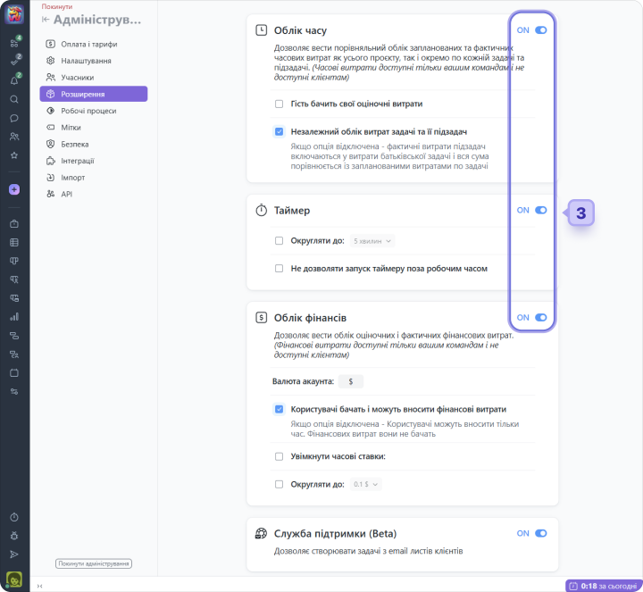 *Ми рекомендуємо на самому початку роботи відключити додаткові можливості, що значно спростить функціонал і пришвидшить інтеграцію команди до роботи з системою.