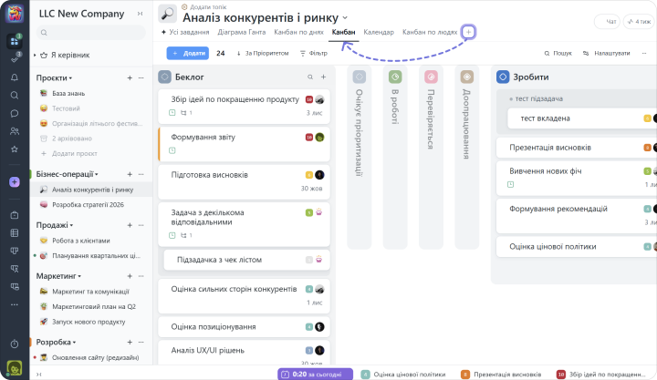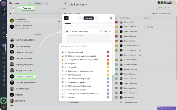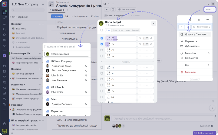 Ви можете переглядати завдання співробітників, бачити перевантаження чи вільні проміжки й одразу додавати нові задачі до їхнього розкладу. Це допомагає ефективно планувати робочий час команди.