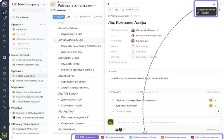 Дашборд акаунту — це центр керування: він показує стан робіт, прогрес і активність команди. У віджетах зібрані ключові показники та списки (задачі, проєкти, люди, події, чати) з фільтрами й переходами в деталі — щоб миттєво побачити, що відбувається, і діяти.
