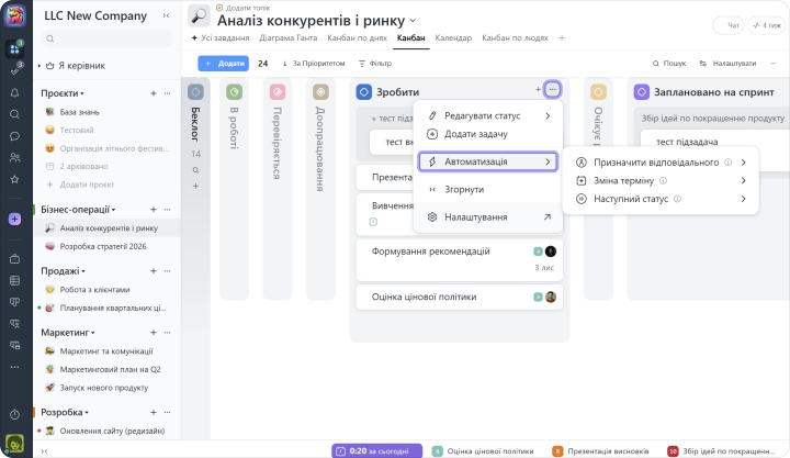 Ви можете налаштувати автоматизації для кожної з колонок канбану: