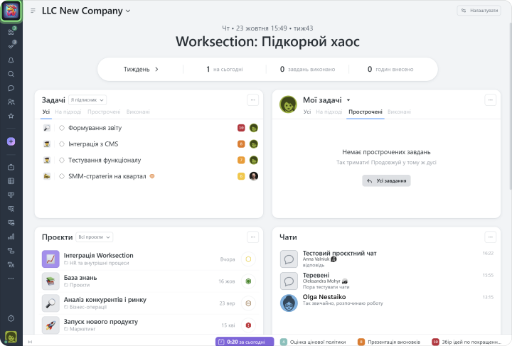 Трей у системі Worksection відображається на всіх сторінках і розташований внизу кожної сторінки у вигляді рядка. Він є зручним інструментом для швидкого доступу до персонального вікна витрат/планування дня, задач, чернеток задач, чатів та вікна попереднього завантаження файлів.