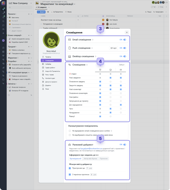 5 підключити або ж відключити Ранковий дайджест (статус проєктів та задач на день).