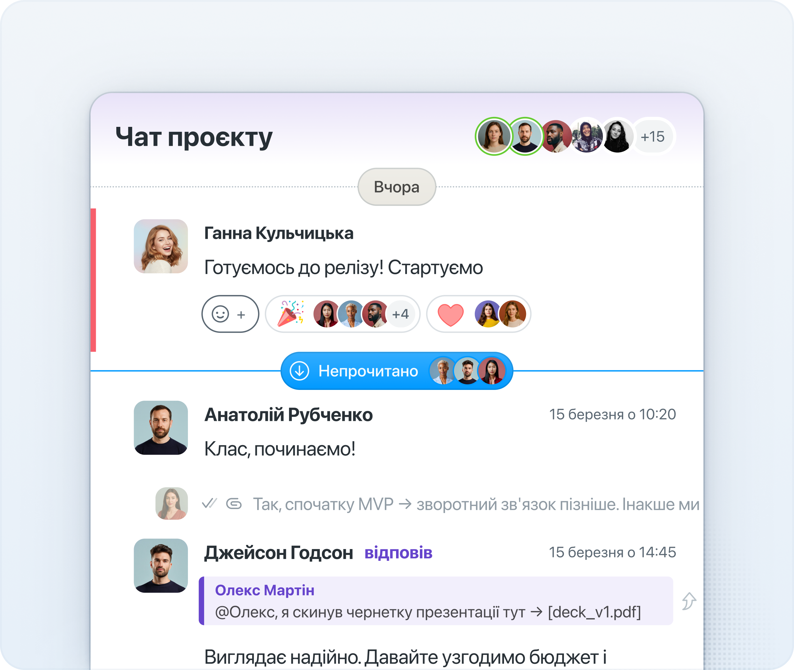 Приватні, групові та проєктні чати прямо в системі. Згадуйте колег і задачі з чату, використовуйте threads для обговорень і плануйте відправку повідомлень. Більше не потрібно перемикатися між різними сервісами.